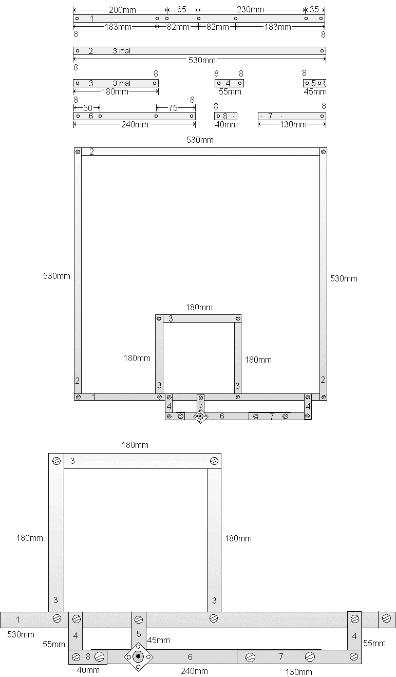 Nun die Bauteile entsprechend der Zeichnung mit den Schrauben und Muttern zusammenschrauben. Für die Ecken der beiden Rahmen die Stoppmuttern verwenden. Die Schrauben nur soweit anziehen, dass das Gelenk gerade noch beweglich ist. Die 3,5 mm Schraube zur Befestigung der Leiste 6 an der PL-Buchse (Seele) verwenden.