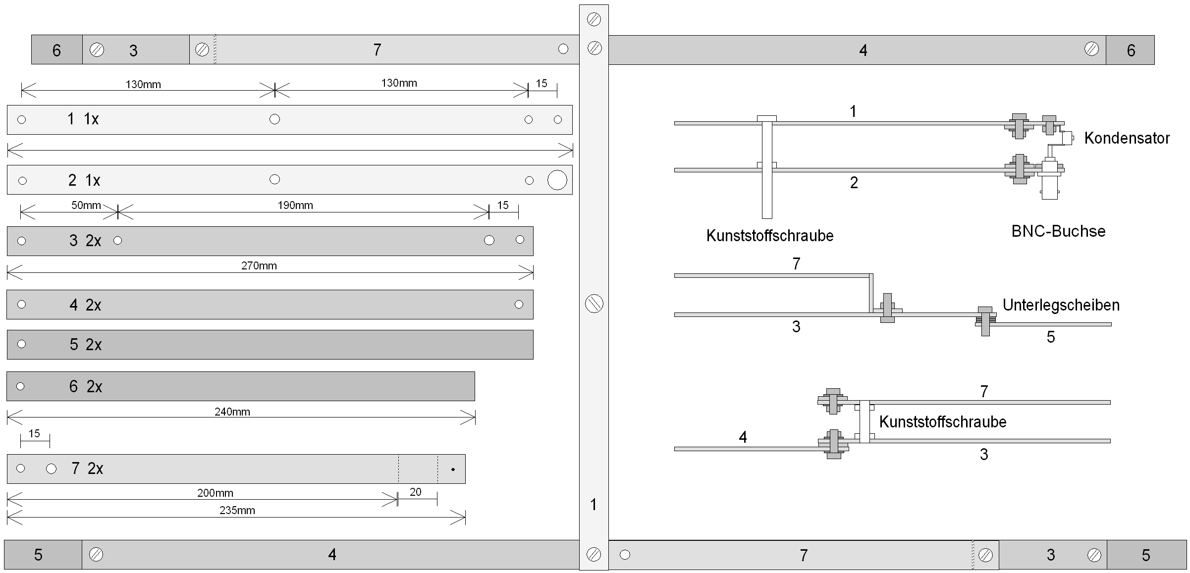 Die Löcher ( · ) in den Leisten 7 werden erst nach der Montage der Antenne passend durch die Leiste 3 gebohrt.