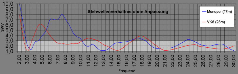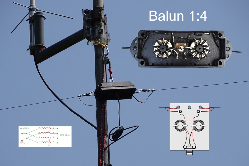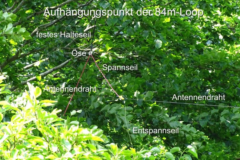 Endgespeister, etwa 17m langer Stahldraht mit 2,0 mm Durchmesser horizontal in 9m Höhe gespannt. Die Anpassung erfolgt mit einem Ringkern-Balun mit speziellem Abgriff 1:12, ähnlich der VK6.